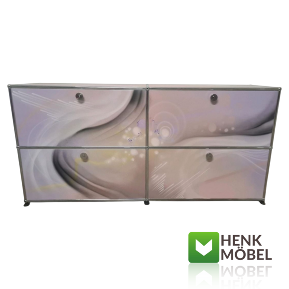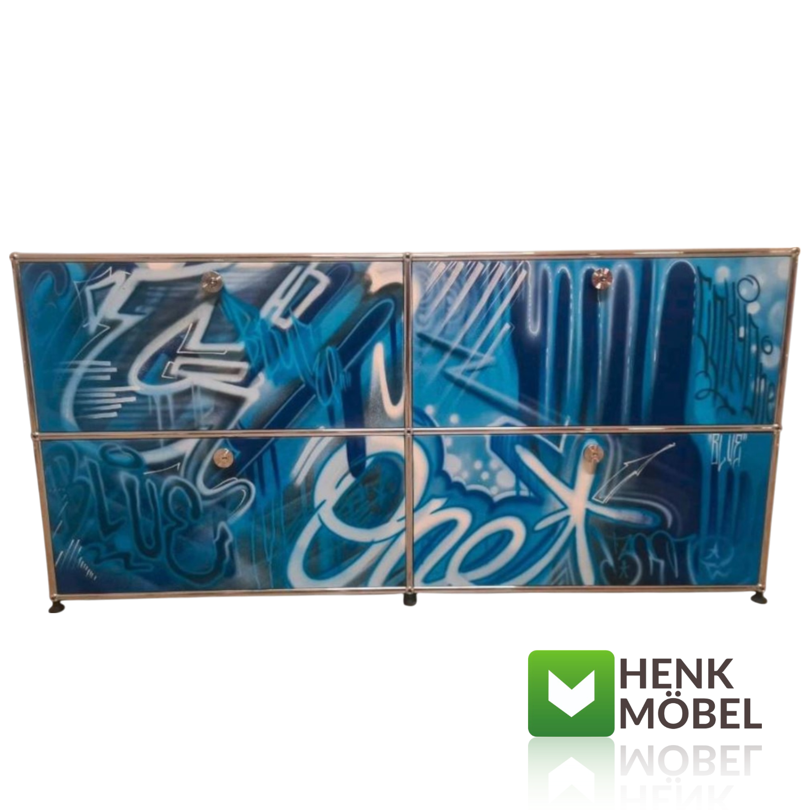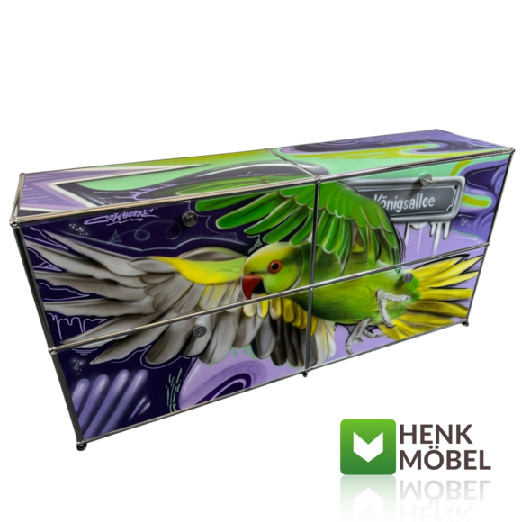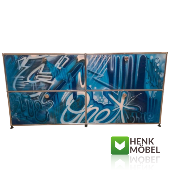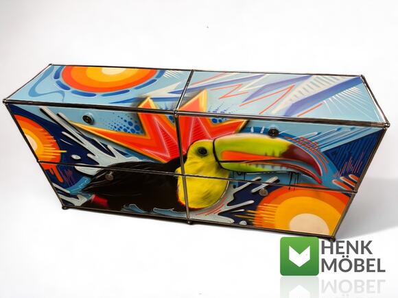 Bei Henk Möbel treffen ikonische Klassiker auf individuelle Ausdruckskraft: Dieses kunstvoll gestaltete Sideboard von USM Haller ist mehr als ein Möbelstück – es ist ein Statement. Jedes Motiv wird in enger Zusammenarbeit mit Künstler*innen, Designschaffenden oder direkt nach Kundenwunsch umgesetzt und macht aus dem funktionalen Designklassiker ein einzigartiges Unikat.