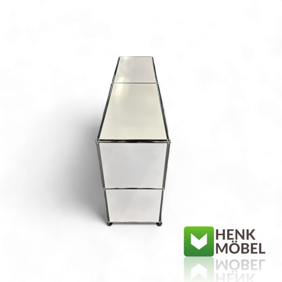 Dieses USM Haller Sideboard strahlt Leichtigkeit und Struktur zugleich aus. Mit vier offenen Fächern bietet es nicht nur großzügigen Stauraum, sondern setzt Ihre Lieblingsstücke gekonnt in Szene – ob Bücher, Deko oder Designobjekte. Die helle Farbgebung in Kombination mit der klassischen Chromstruktur wirkt modern, klar und gleichzeitig wohnlich.